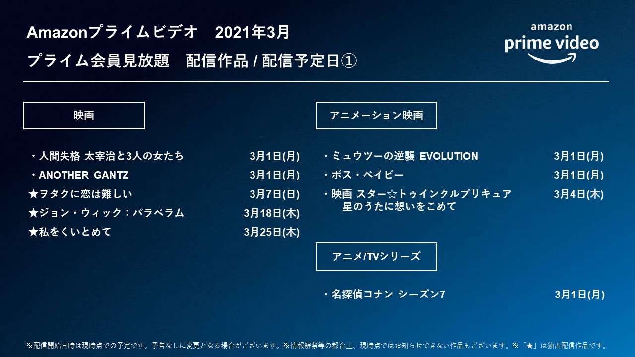 Amazon Prime Video プライムビデオ Amazonプライムビデオ 3月 配信作品 一覧 星の王子 ニューヨークへ行く 2 ジョン ウィック パラベラム ヲタクに恋は難しい 人間失格 太宰治と3人の女たち 私をくいとめて ミュウツーの逆襲